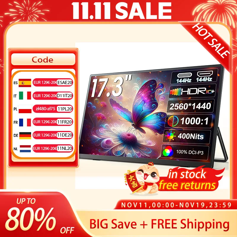 UPERFECT 17,3''Tragbarer Monitor 144 Hz 2560 x 1440p UHD HDR Computerbildschirm 320cd/m2 HDMI USB-C ...