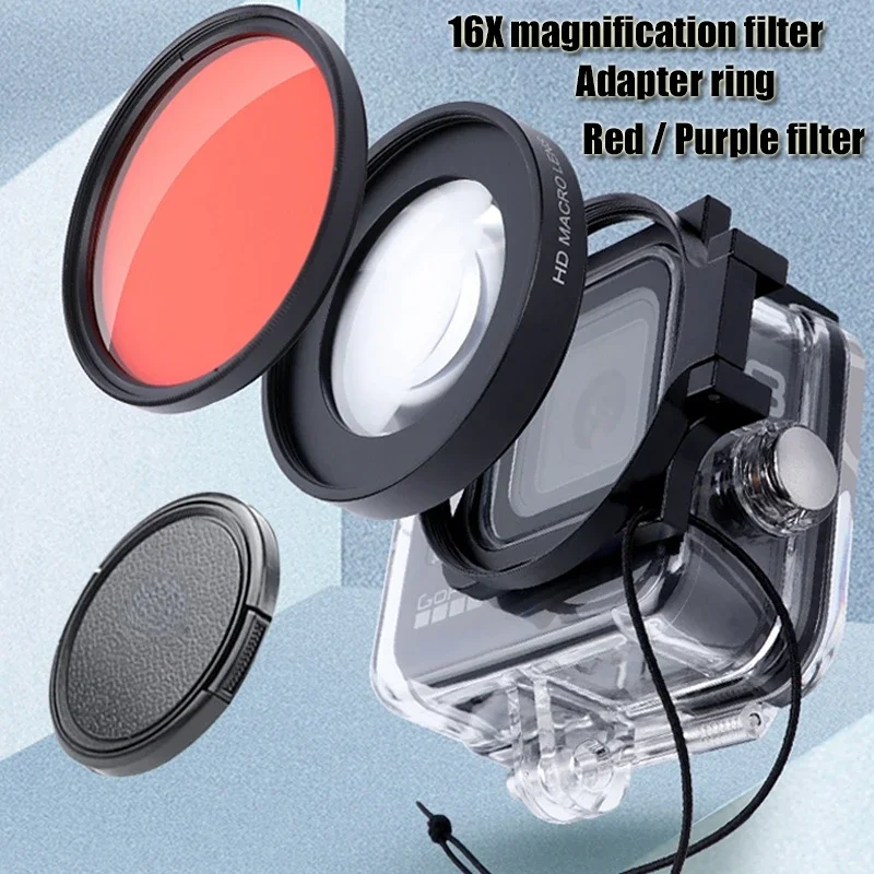 16x HD-Makroobjektiv + rot-lila Tauchfilter 58 mm Adapterring-Objektivdeckel für GoPro Hero 10 ...