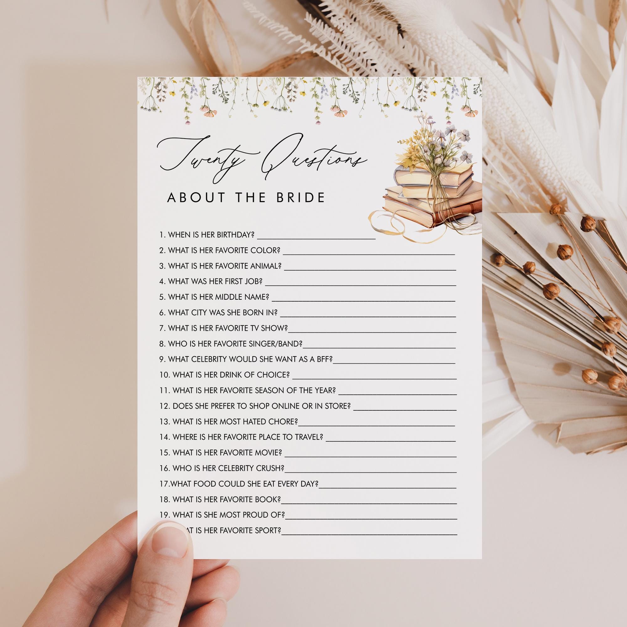20 Fragen über die Braut, Wildblumenbuch Brautduschenspiel, Wi...