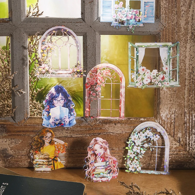 10 Blatt Mädchen Blumen Fenster PET Aufkleber Materialien Collage Junk Journal DIY Scrapbooking...