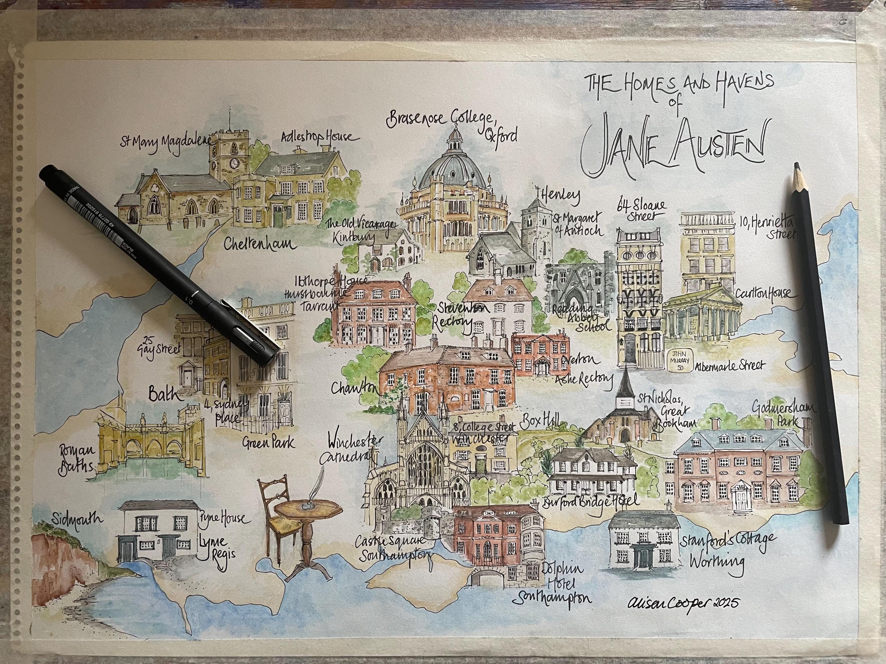 Diese handgezeichnete Karte zeigt viele der Orte, von denen bekannt ist, dass sie Jane Austen, eine ...