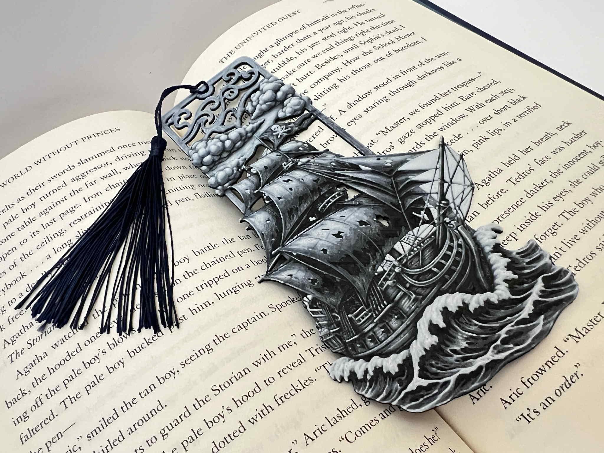 Geisterhaftes Piratenschiff Lesezeichen mit schwarzer Quaste.