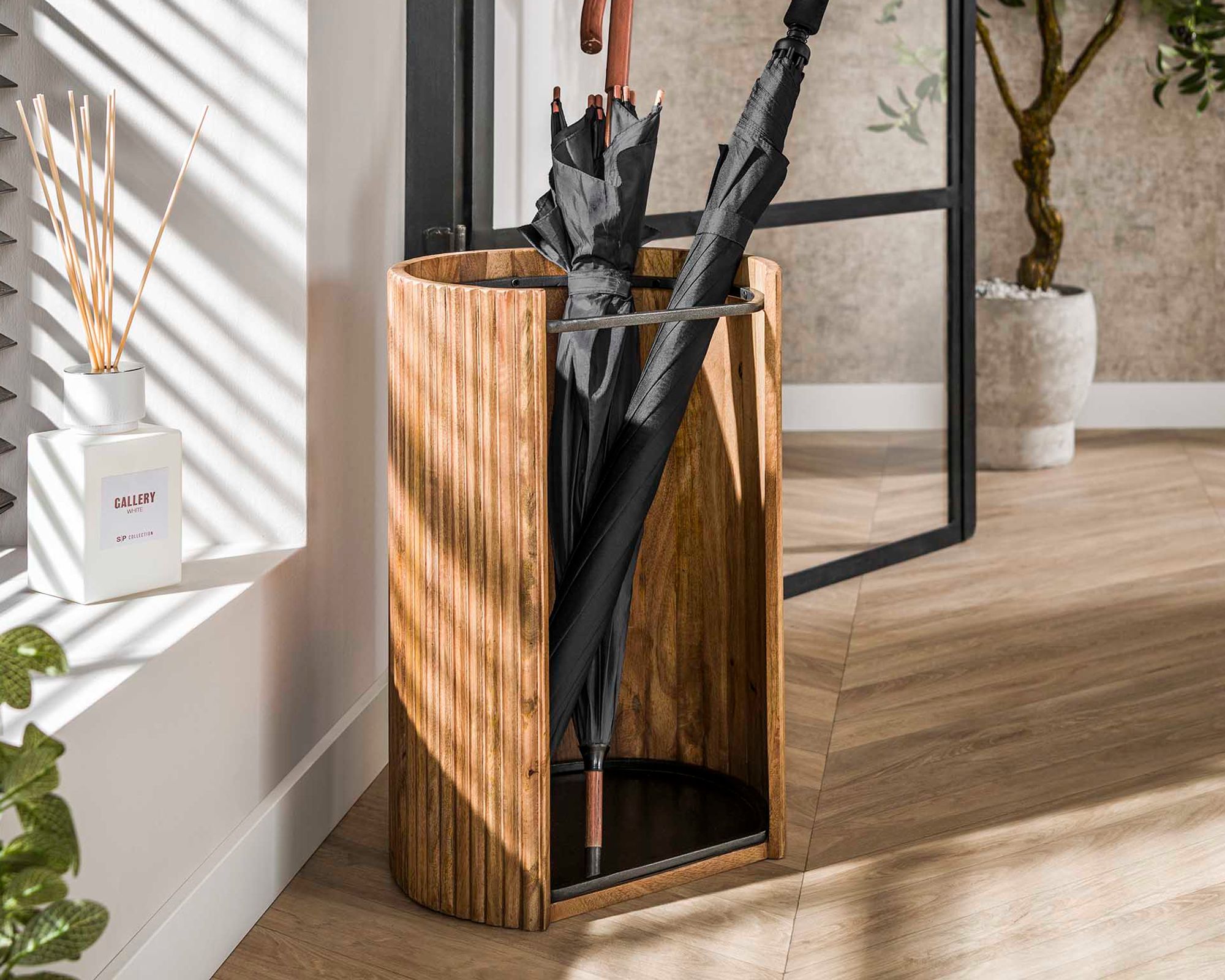 Der Schirmständer Wave besteht aus sandfarbenem Mangoholz mit Wellenmuster an der Außense...
