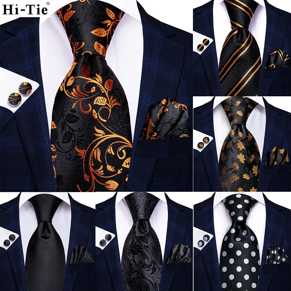 Hallo-krawatte Schwarz Gold Solide Silk Hochzeit Krawatte Für Männer Hanky Manschetten Ges...