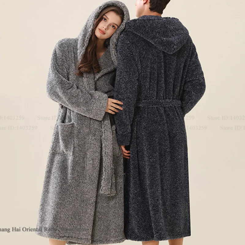 Winter Paar Flanell Robe Mit Kapuze Bademantel Kimono Kleid Verdicken Warme Korallen Fleece Nachtw&a...