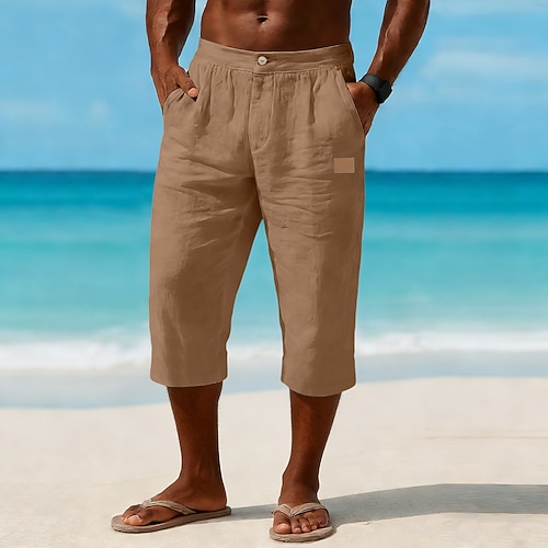 Herren Leinenhosen Caprihose Sommerhose Strandhose Tasche Elastisch...