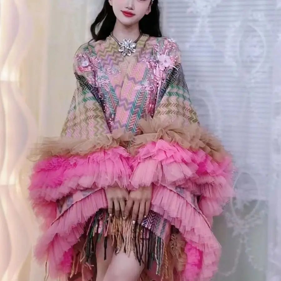 Ethnische Blumen Stickerei Plaids Schal Pullover Mantel Mesh gespleißt Rüschen Quasten St...