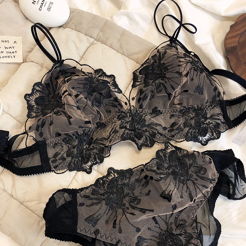 Französisch Spitze Blumen Stickerei BH-Set sexy ultra dünne Frauen Unterwäsche neue D...