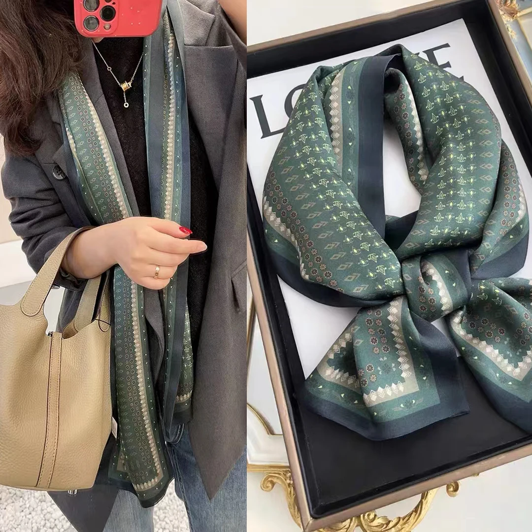 BYSIFA | Grau Blau Lange Silk Schal Haarband Frühling Herbst Mode Geometrische Muster Reiner Se...