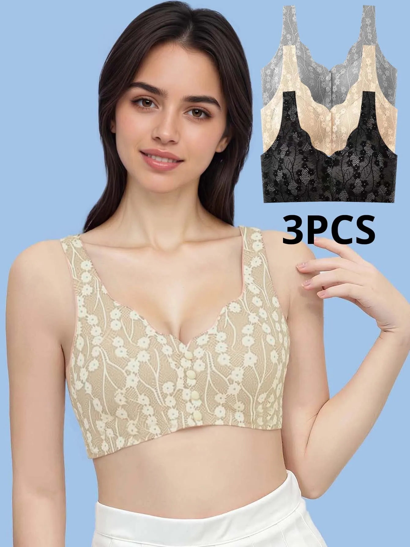 3-teilige BHs mit Knopfverschluss vorne ohne Polsterung – praktischer, kabelloser, nahtloser S...