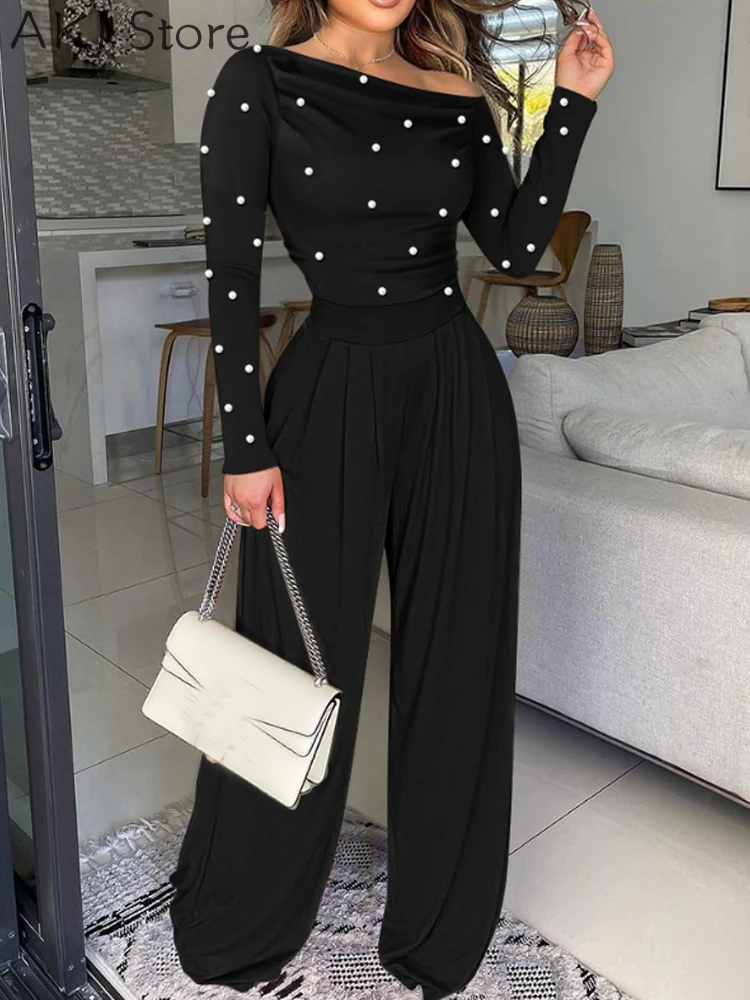 Perlen-Dekor, Schräghals-Langarm-Overall, lässiger, ger&u...