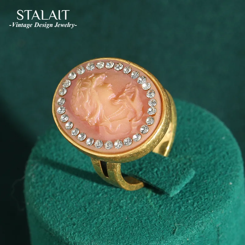 Vintage Cameo Pink Ringe Oval Relief Beauty Head Set Weißer Strass Französische Handwerks...