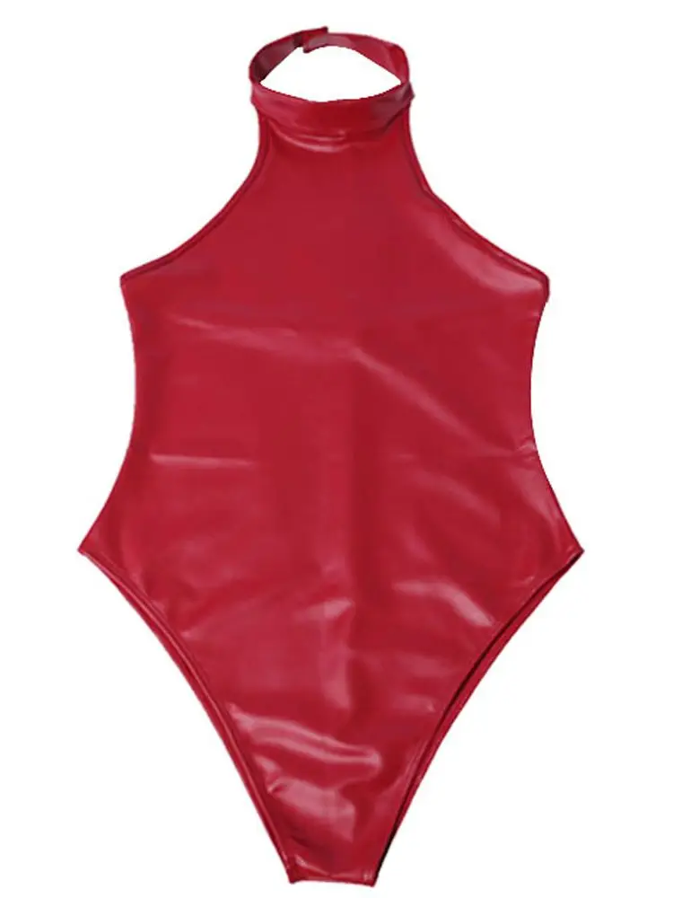Faux Latex Pu Leder Catsuit rücken frei nass Look PVC Badeanzug glänzend Pu Leder engen Sc...