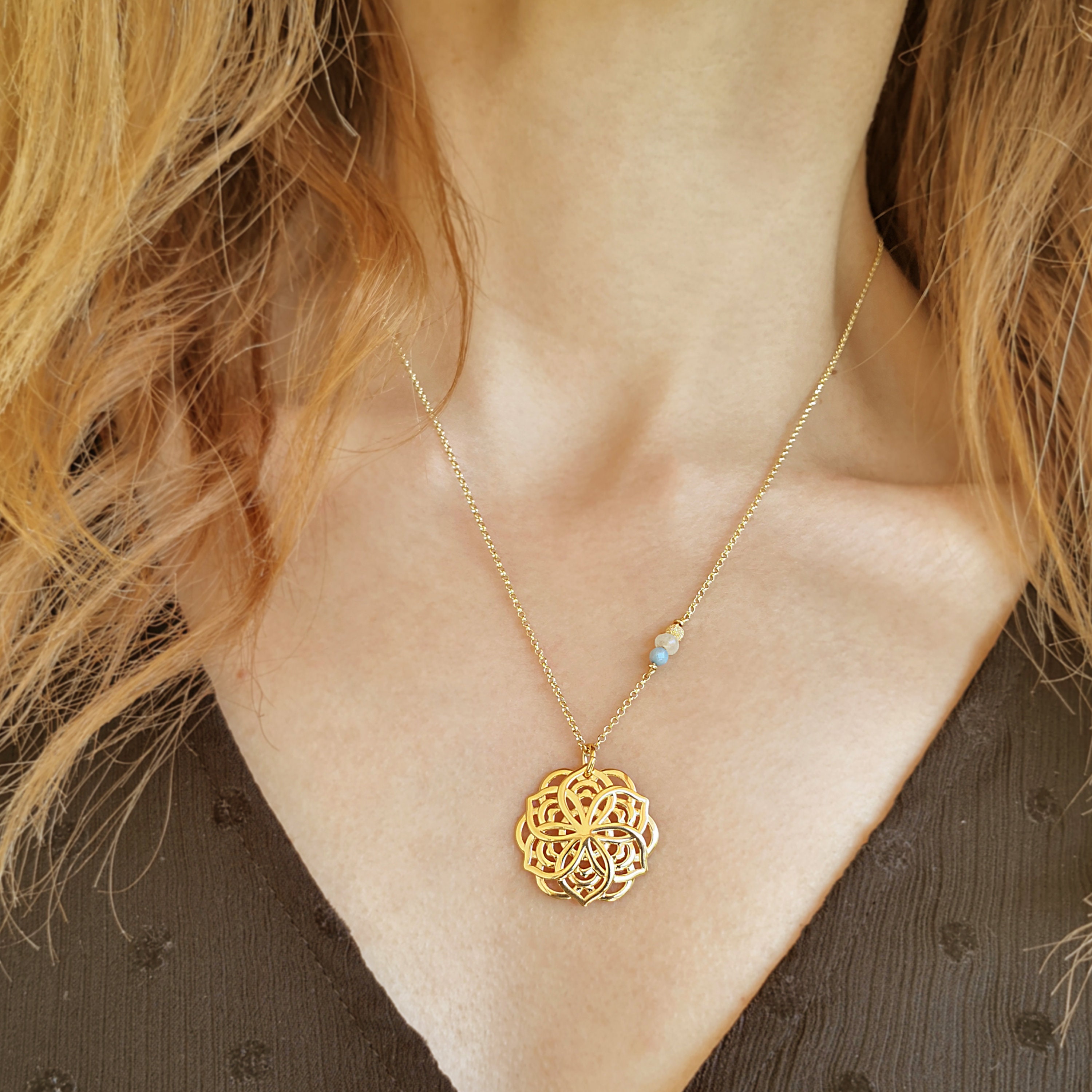 Positive Energie Zierlicher Boho Anhänger>> Mandala Halskette! ️ Vergoldetes 925 S...