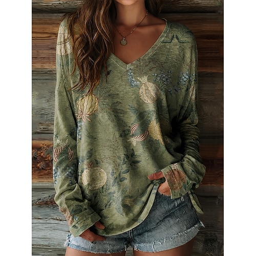 Damen Bluse Druck Blumen Bohemien Vintage Lässig Langarm V Aus...