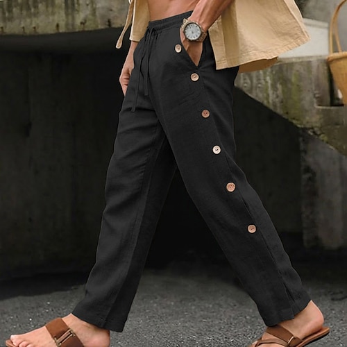 Herren Leinenhosen Sommerhose Kordelzug Elastischer Bund Seitenknop...