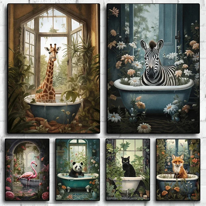 Tiere Badewanne Katze Hund Giraffe Wanne Blume Vintage Poster Gothic Dark Academia Wand Kunstdruck L...
