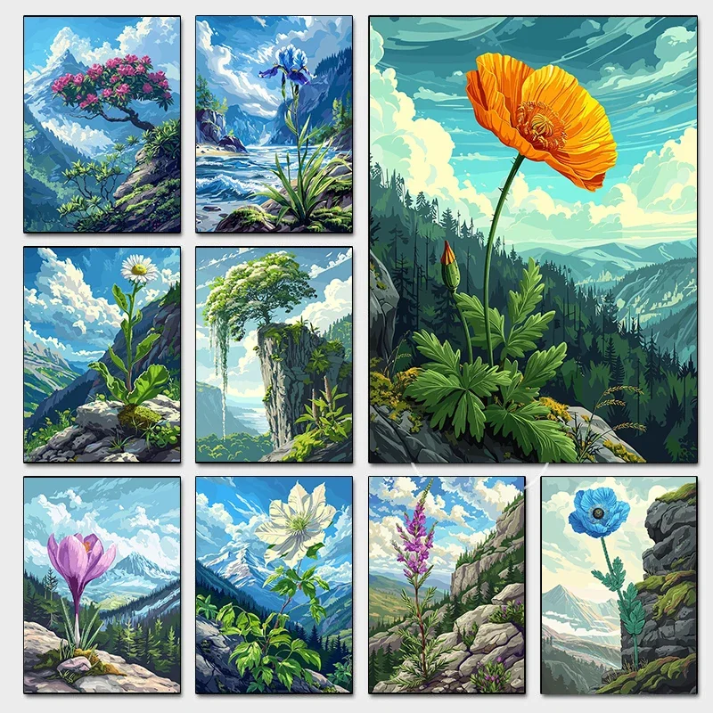 Blumen auf Cliffside Landschaft Poster Berg See Krokus Blume Drucke Leinwand Malerei Wand Kunst Bild...