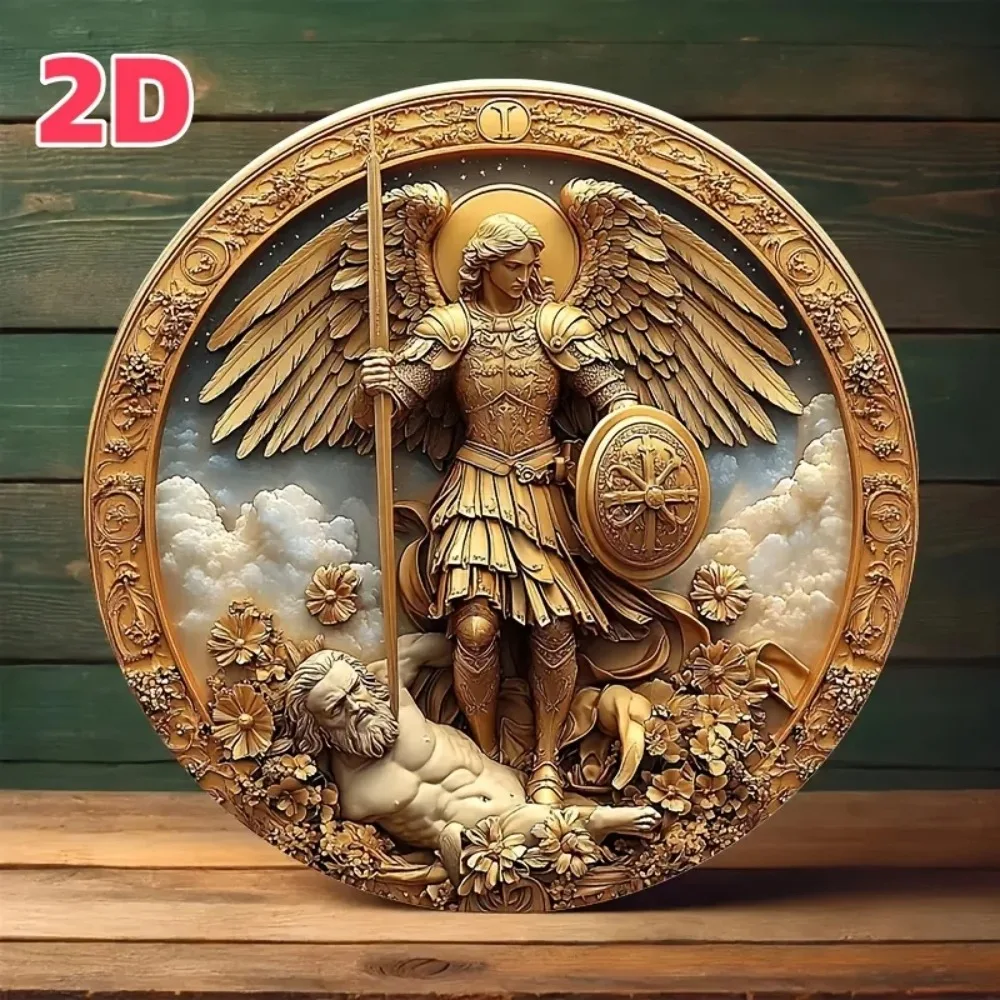 2D-Schild im Retro-Stil zum Aufhängen an der Wand: Goldener Erzengel St. Michael mit Schwert &u...