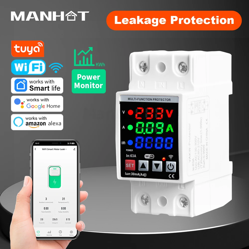 Manhot WiFi 63A Leistungsschalter Leckageschutz DIN-Schiene 3-in-1-Display Überspannungsstrom u...