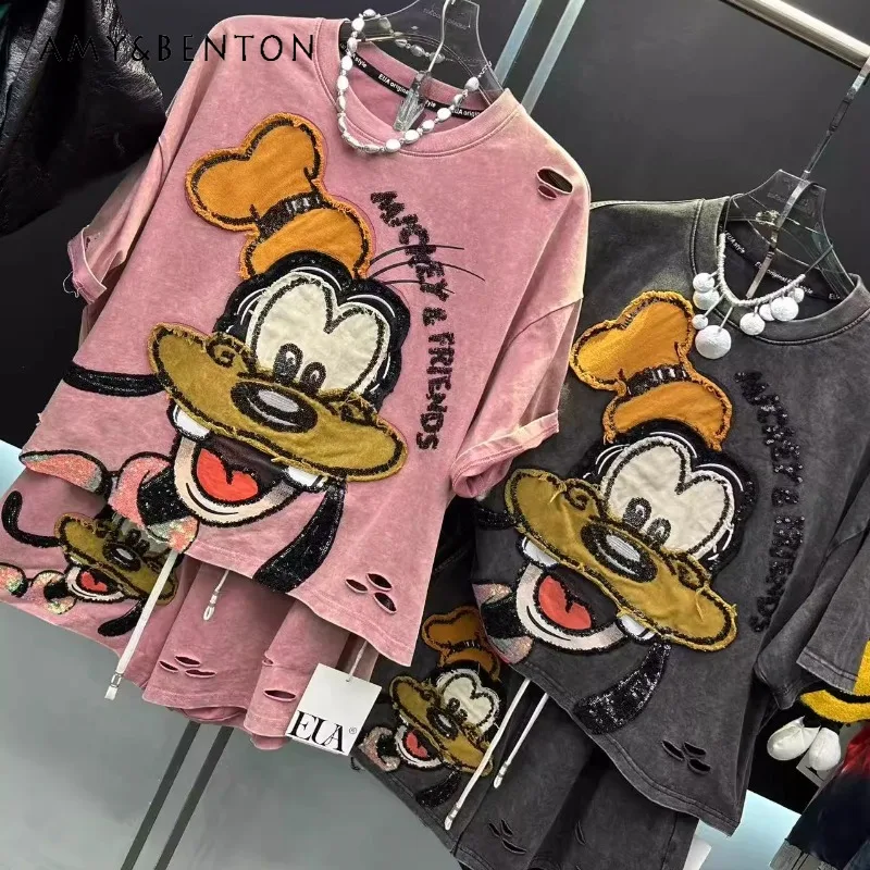 Sommer Neue Schwere Aufkleber Gestickte Cartoon Kurzarm T-shirt Shorts Anzug frauen Lose Alter-reduz...