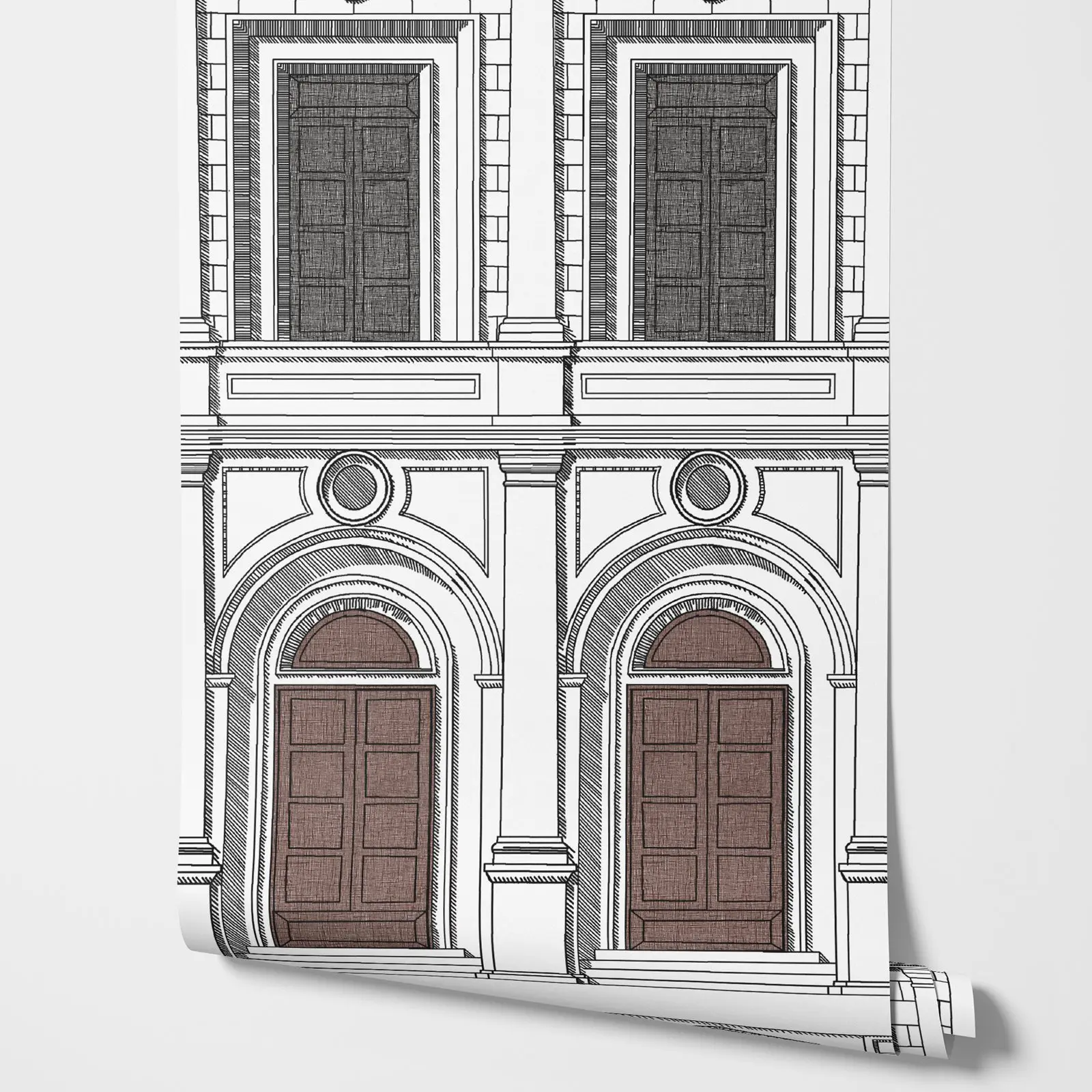 Elegante Architekturlinien Tapete in Schwarz und Braun, Säulen und Fenster im antiken Palast, n...