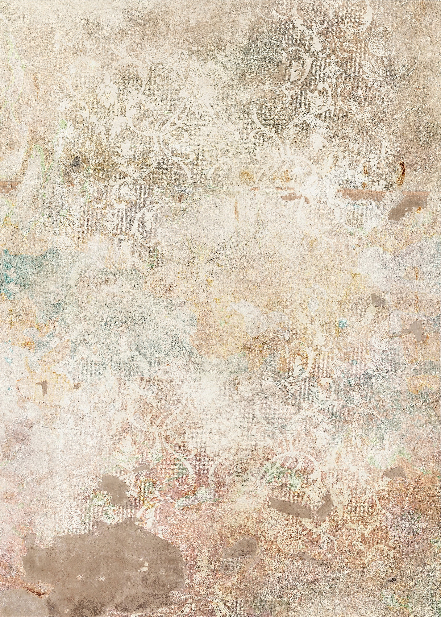 Florale Elemente zeichnen sich auf der vergilbten Betonoptik in pastelligen Farbtönen ab., Opti...