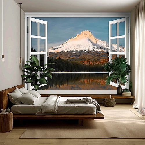 3D-Wandteppich mit Naturmotiv: Fensterblick, ruhiger See, Bergwaldl...