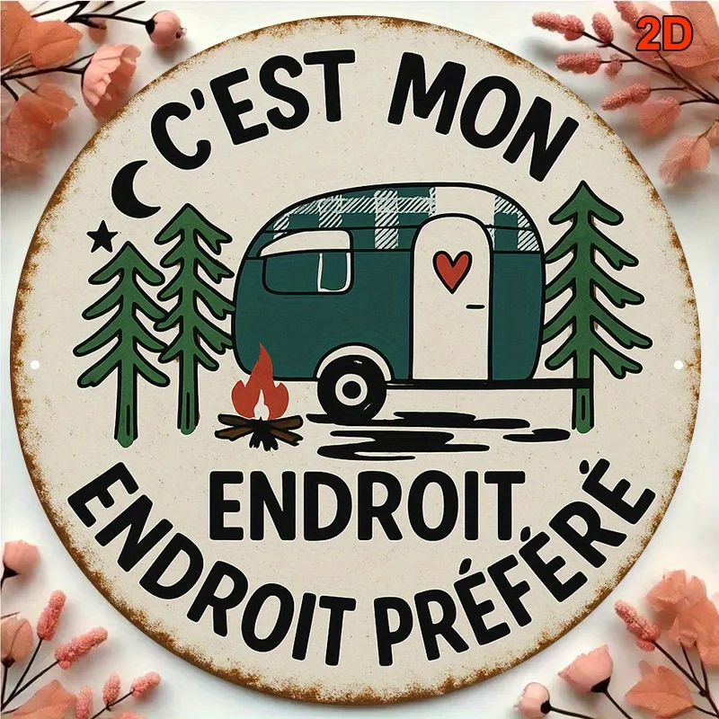 Runde französische Vintage-Aluminium-Beschilderung, nostalgische Vintage-Camping-Hütte im ...