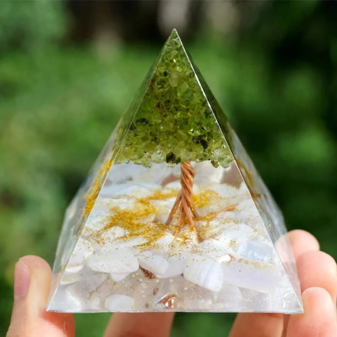 1 Stück Peridot mit weißem Achat, Baum des Lebens, Orgon-Pyramide, Pyramiden-Ornament, Pe...