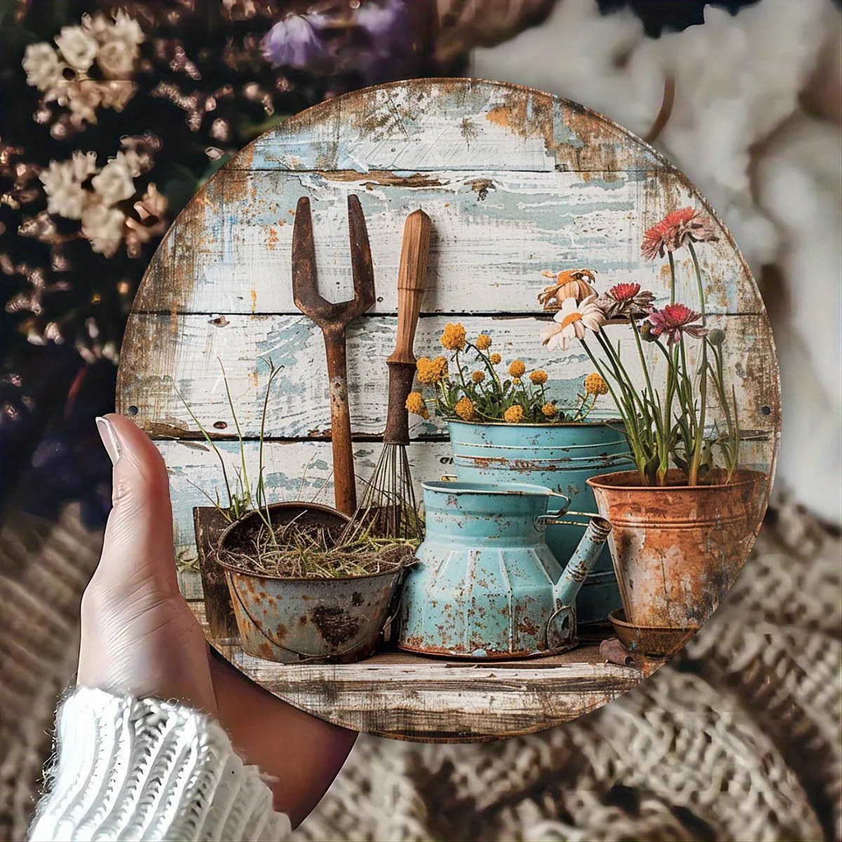 8 Zoll 2D flache Vintage Holz runde Scheibe Blumentopf Garten Werkzeug Schild Land Bauernhaus Anh&au...