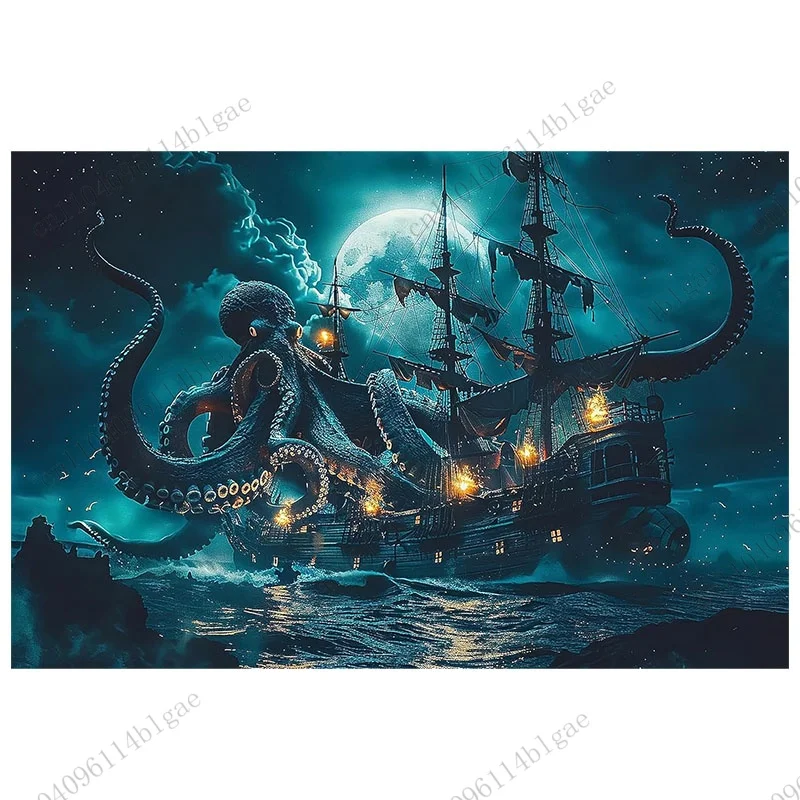 Mondscheinender Oktopus, Angriffsschiff, Fantasy-Kunst, Wandteppich, thematische Raumdekoration, Won...