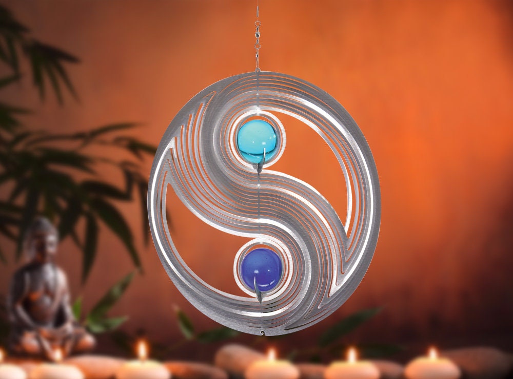 Windspiel Edelstahl Wind Spinner Yin Yang mit 2x50mm kobaltblau und...