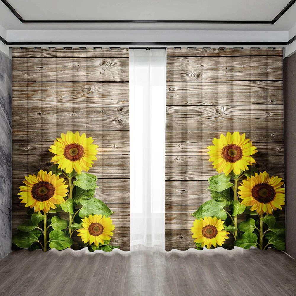 2 Stück dekorative Vorhänge – Sonnenblumen auf ländlichen Holzwänden &ndas...