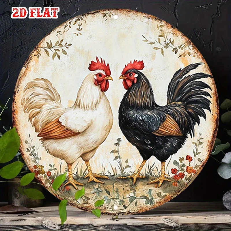 1 Stück rundes Aluminiumschild im Vintage-Bauernhaus-Stil – Hahn- und Hennen-Design, perf...
