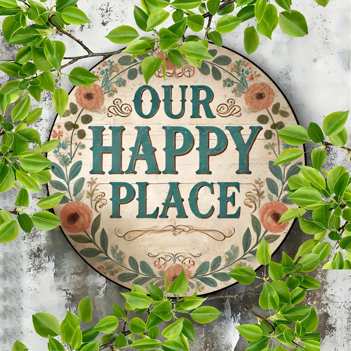 Rundes Vintage-Aluminiumschild „Our Happy Place“ – UV-gedruckt, wasserdicht und la...