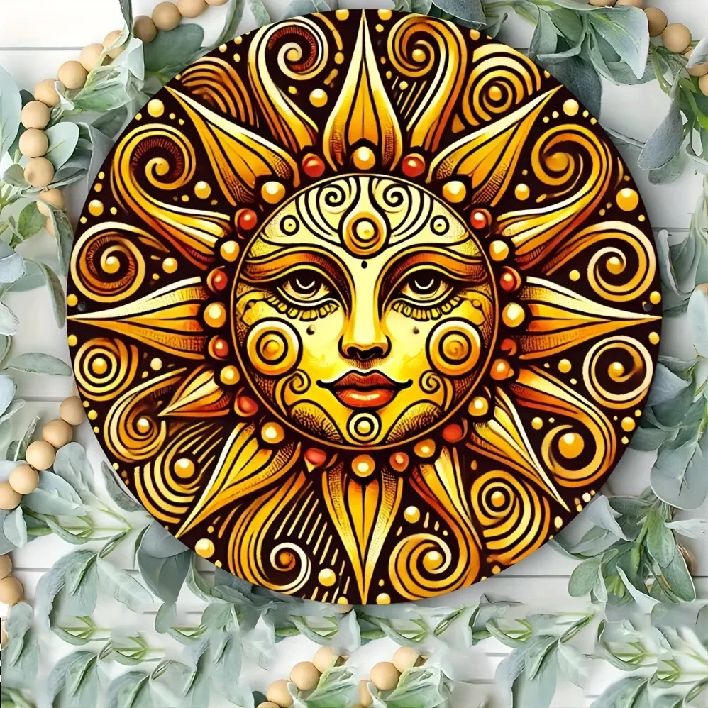 Vibrant Smiling Sun Metall-Wandkunst – Rundes Eisenschild mit buntem himmlischem Design | Powe...