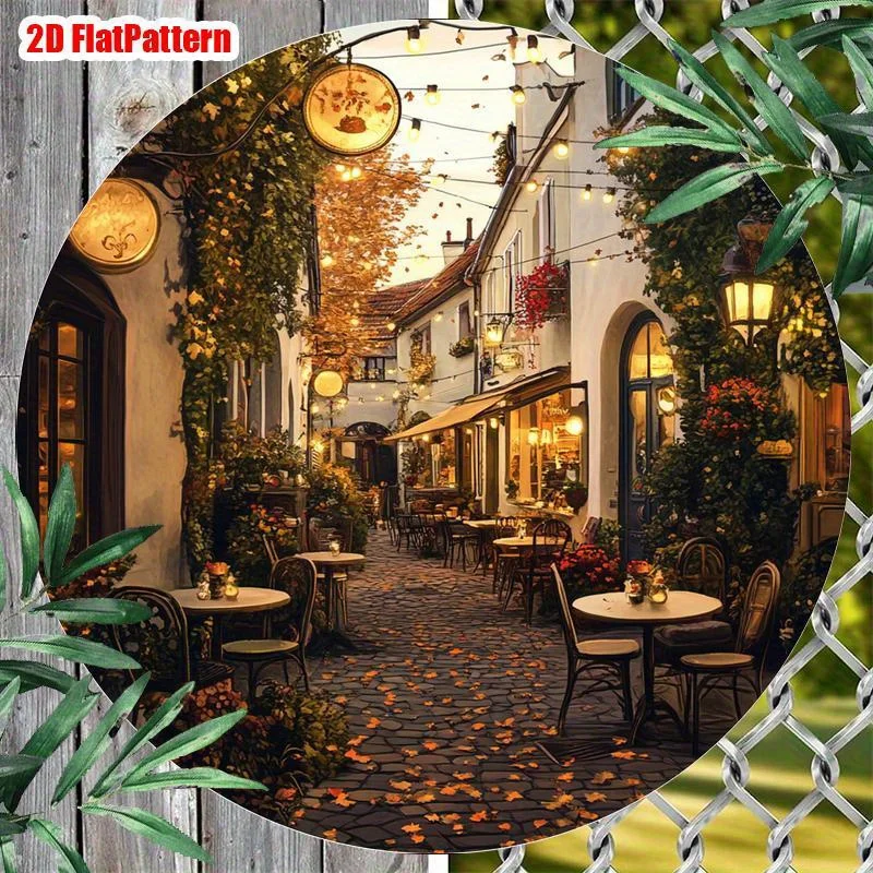 2D flach, 1 Stück Vintage-Wandkunst aus Metall – Herbst-Straßenszene, rundes Alumin...