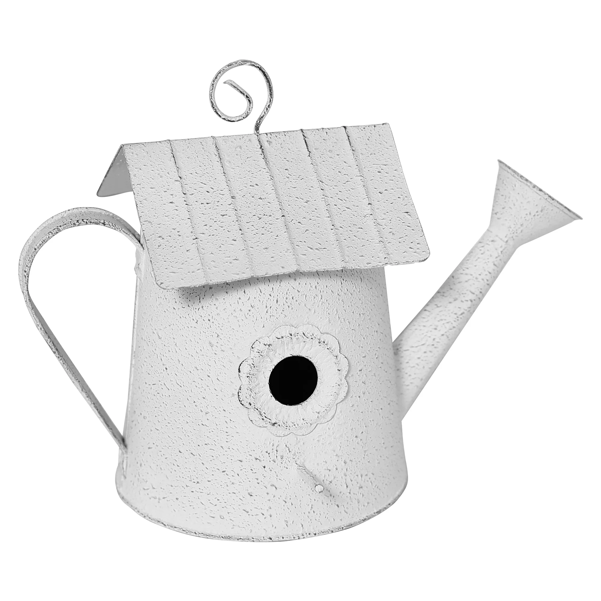 Vintage weißes Vogelhaus, Gartenbaum hängende Nistkasten, Gießkanne aus Eisen im Re...