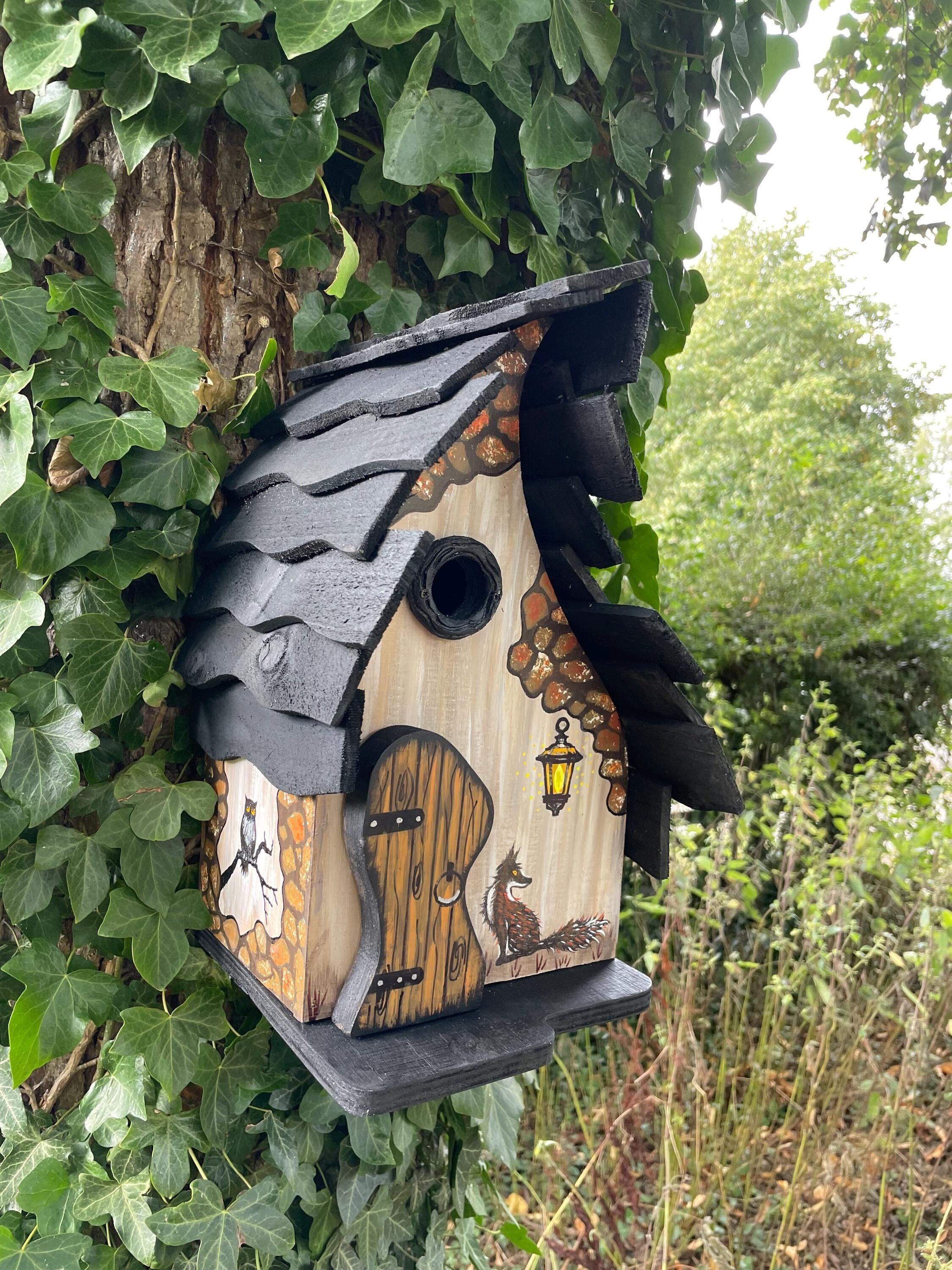 Witziges Vogelhaus mit Fuchs, Eule, Laterne und Feentür. Diese...