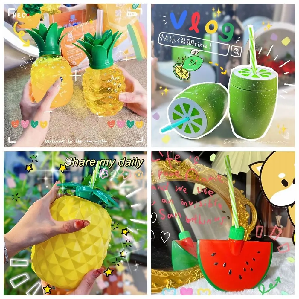 Cartoon Obst Stroh Tasse Geschenk Wassermelone Zitrone Erdbeere Ananas Wasser flasche Lebensmittel q...