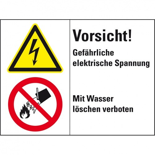 Kombischild mit Symbolen Vorsicht! Gefährliche elektrische Spannung - Mit Wasser löschen v...