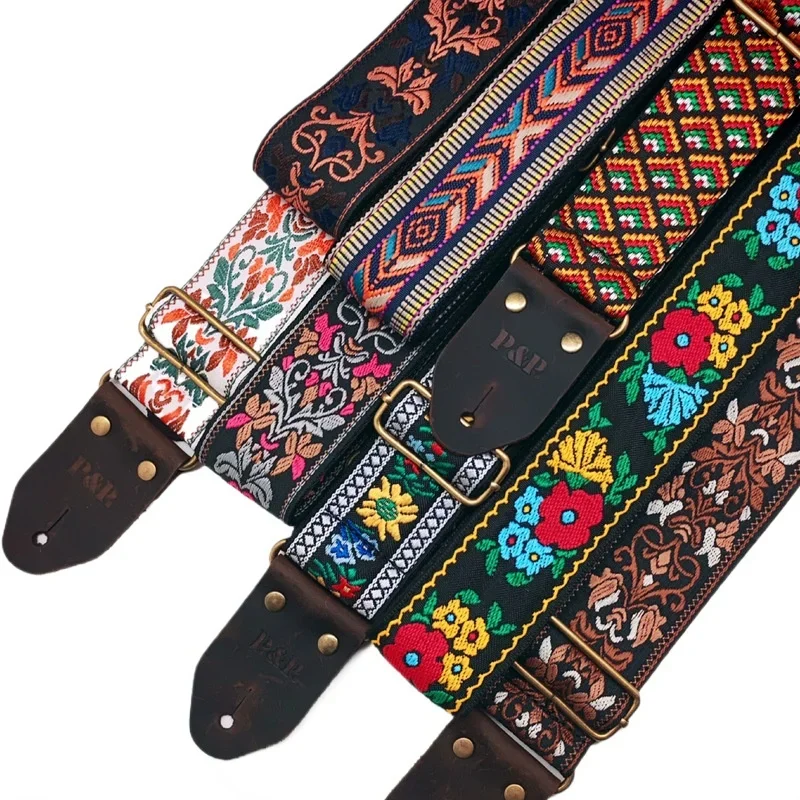 Gitarrengurt mit besticktem Druck, Vintage-Ethno-Stil, verstellbarer Gurt für Folk-E-Gitarre, B...