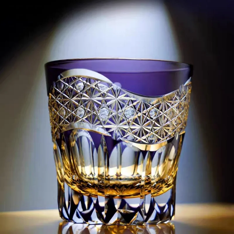 Handgefertigte farbige Whiskygläser von Edo Kiriko, handgeschnitten zu klaren, farbigen, altmod...