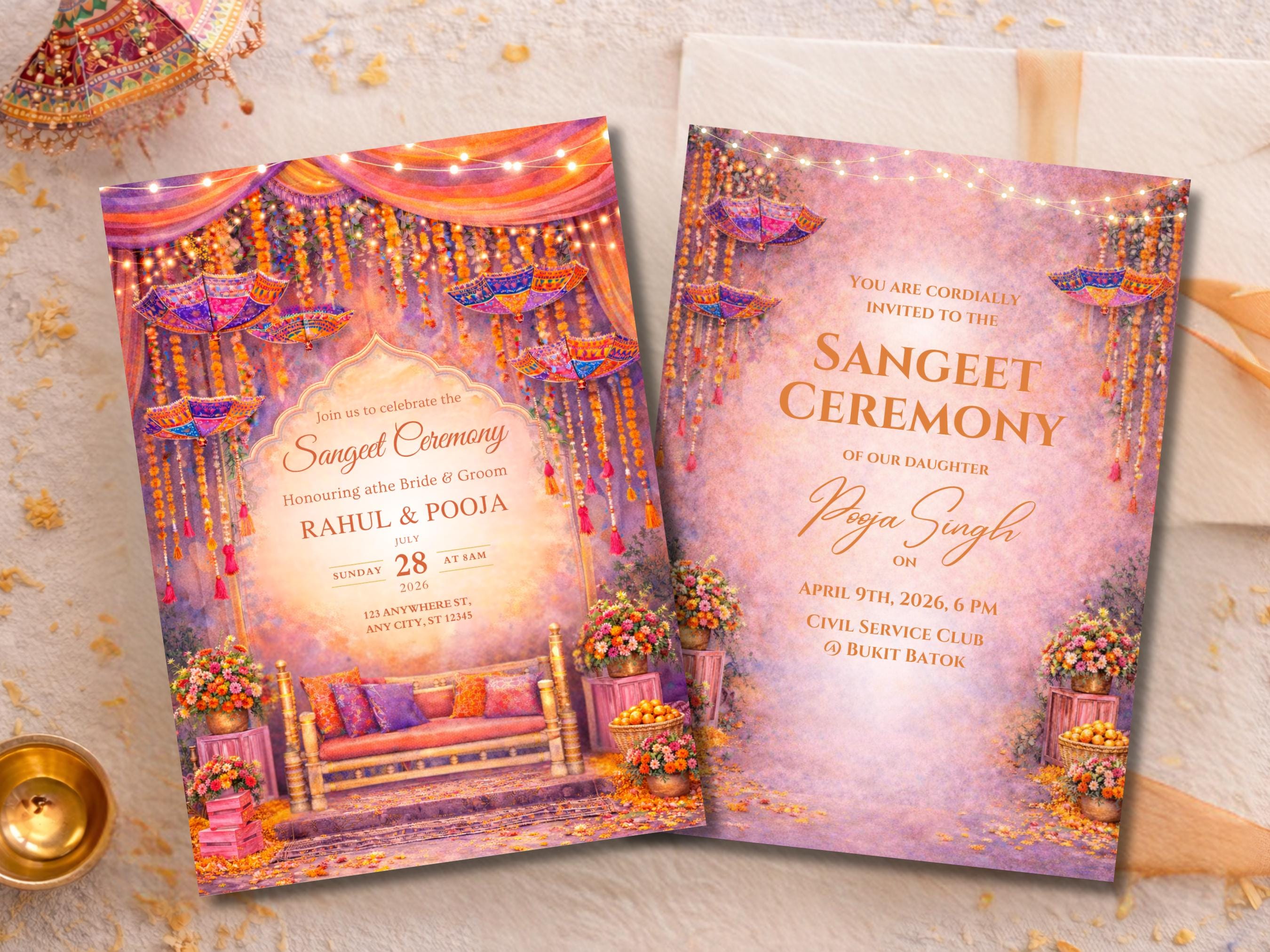 Feiern Sie Ihre Sangeet-Zeremonie stilvoll mit diesem lebendigen, bearbeitbaren Hochzeitseinladungsp...