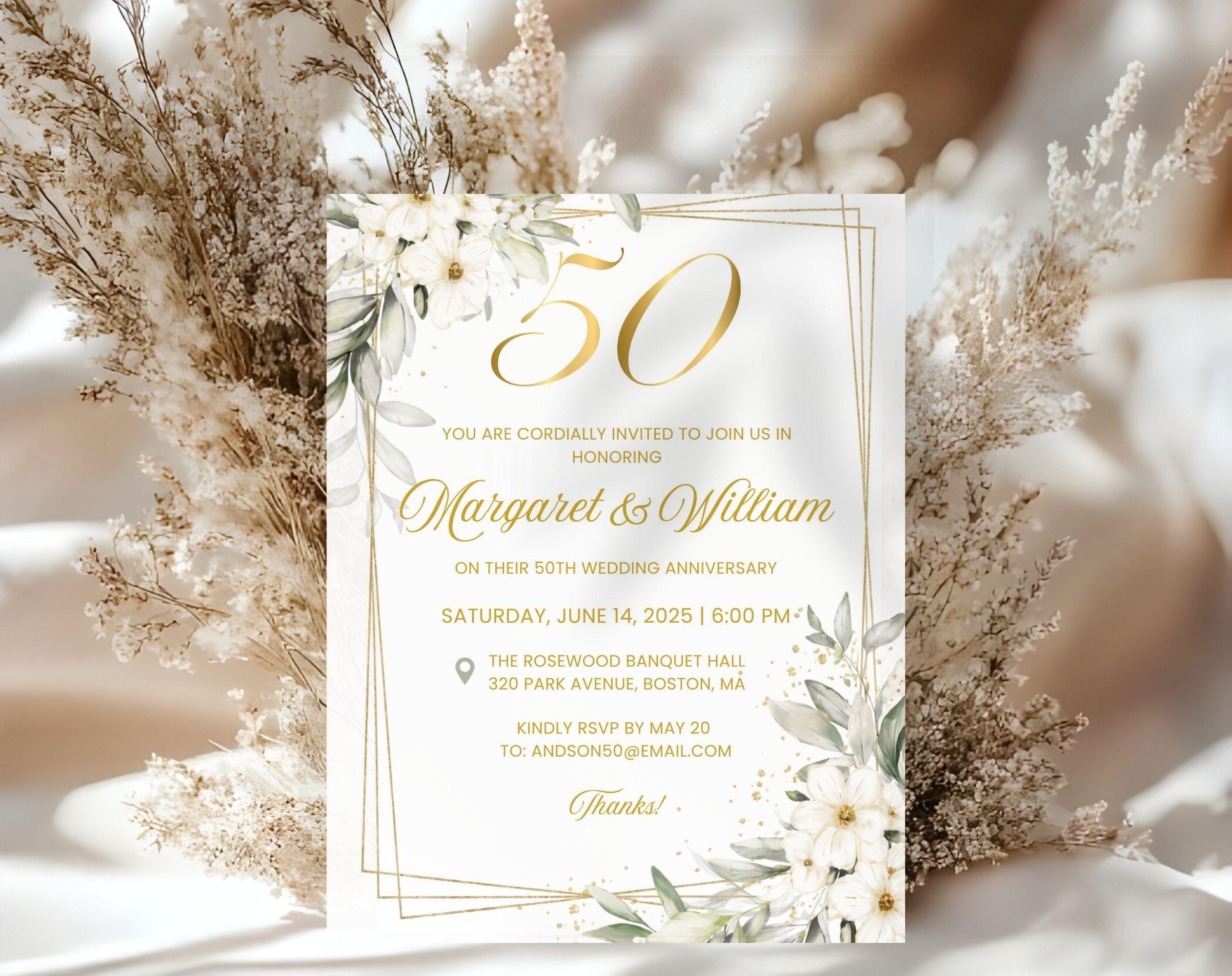 Einladung zum 50. Hochzeitstag - eine Hommage an ein Leben voller Liebe. Diese weiß-goldene Ei...