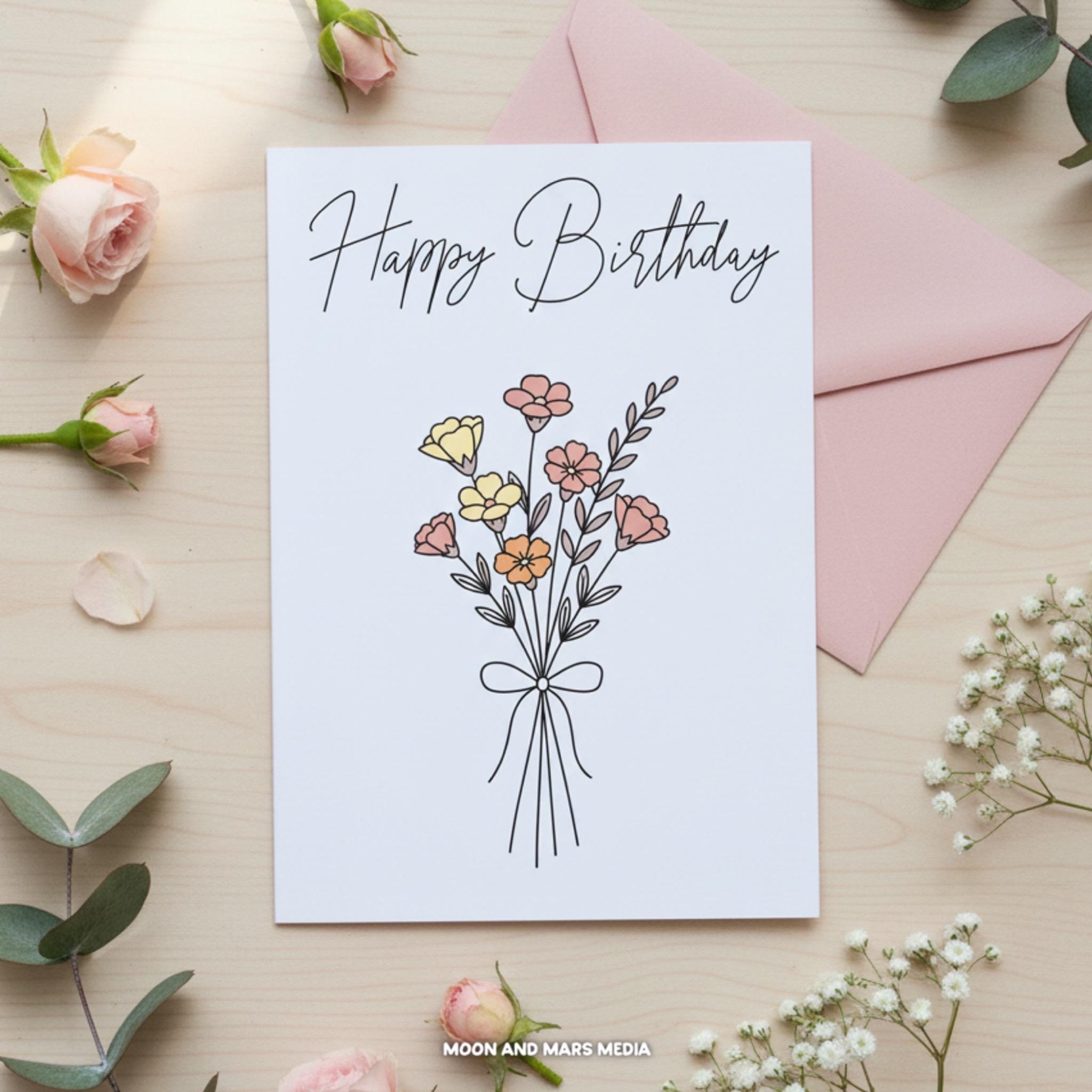 "Eine süße und minimale druckbare Geburtstagskarte mit zarten Blumenillustrationen u...
