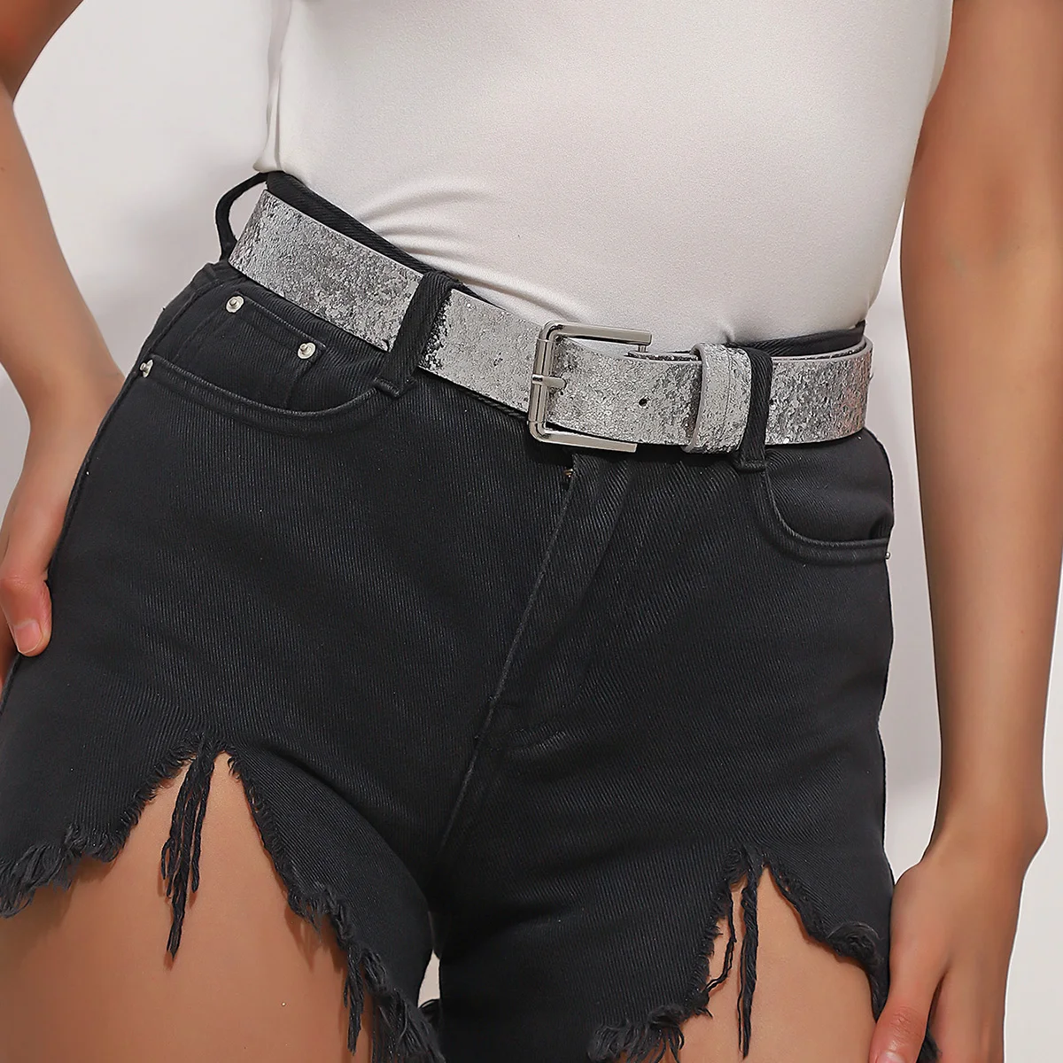 Damen-Gürtel mit Zebra-Metall-Gravur und silbernen Pailletten