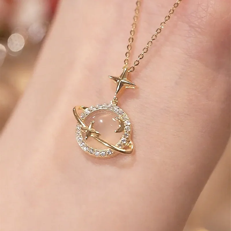 Planet Saturn Titan Stahl Kette Halskette Damen Licht Luxus Transparent Kristall Süße K&u...