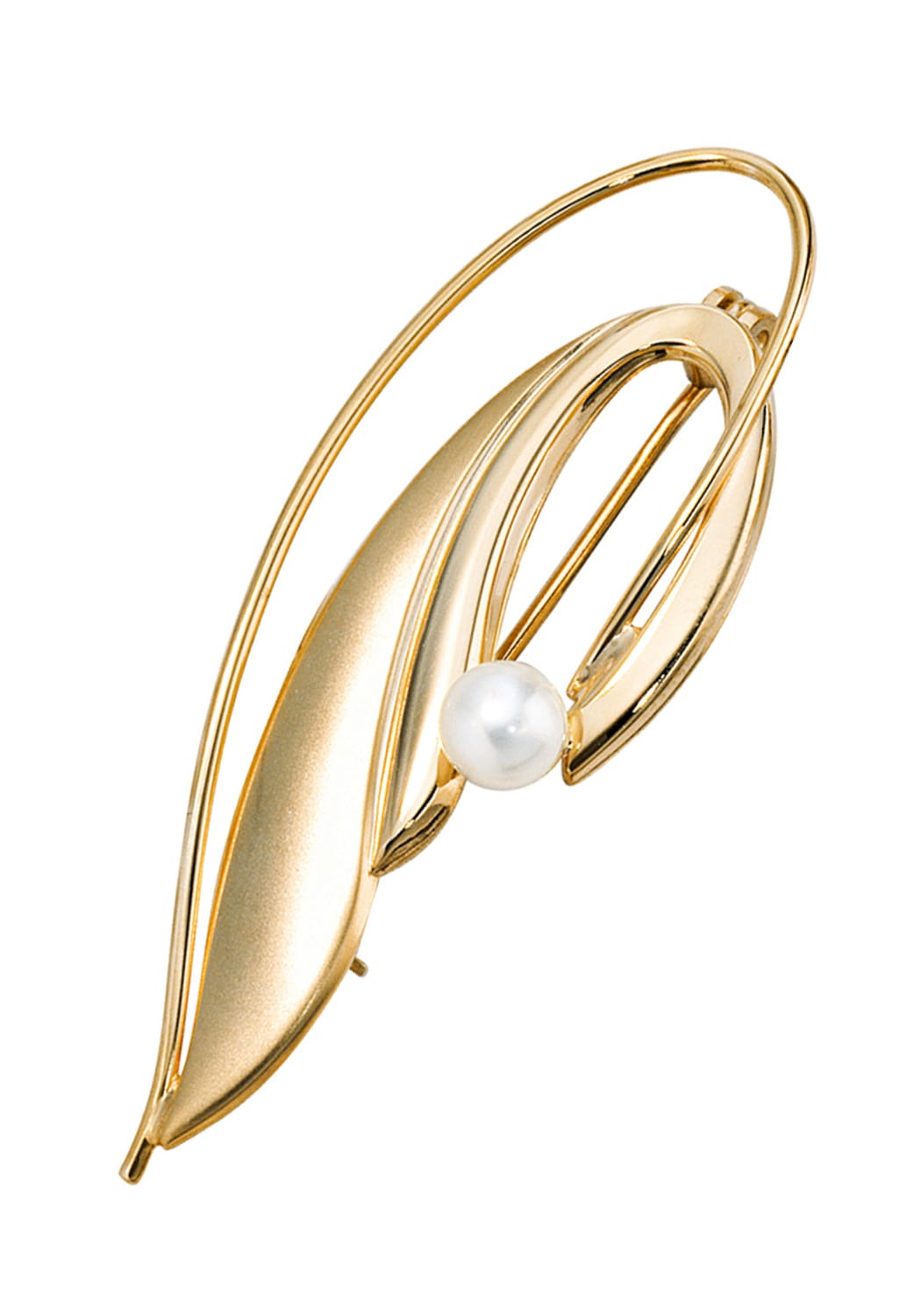 Brosche aus 14 Karat (585) Gelbgold, teilmattiert, mit einer Süßwasser-Zuchtperle, mit Na...